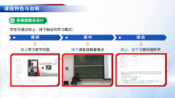 《信息论与编码》课程设有七大章节,第一至第二章节介绍信息论的基本概念和理论模型,包括信息熵、互信息和信道容量等,让学生理解信息论对现代通信系统的理论指导意义;第三章节介绍信源编码的基本原理和方法,包括Shannon-Fano编码和Huffman编码等,让学生了解信息压缩的原理和理论极限,掌握各种主流信源编码技术;第四至七章节介绍信道编码的基本原理和方法,包括香农信道编码定理及证明,循环码、卷积码、Turbo码和Reed-Solomon码等。围绕图1中的课程目标,课程以线上与线下融合的模式,将现代信息技术与线下课堂教学有机融合,显著提升了学生的学习效果。本课程学习难度大,陈立教授通过教学创新,利用自编讲义对知识进行系统性建构,将经典理论与前沿技术进行深度融合,帮助学生更好地理解和掌握课程知识。学生不仅可以在课堂上获得传统的互动式教学,还可利用现代信息技术在多媒体环境中进行丰富的课外学习。例如,学生可以利用线上教学视频与课程讲义提前学习基础知识,通过课堂讲解和板书加深理解,并进一步在课后利用线上习题加以巩固,实现良好的学习效果,如图2所示。图3展现了中山大学的《信息论与编码》课堂。